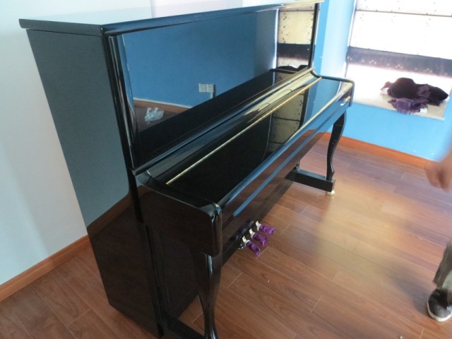 走路時必須注意,鋼琴不能過度傾斜,它與地面的斜度不能超過70度。搬動時,鋼琴背朝墻,鍵盤朝樓梯扶手。二個在下,三個在上,最好用寬布條背在肩上搭著鋼琴的車腳。與此同時,雙手抓住琴背的手柄和鍵盤下面(不能拉鋼琴的腿),將鋼琴抬起,一鼓作氣移到地面,然后休息。尤其注意,鍵盤的一側(cè)不要碰扶手,腳不要碰樓梯。拐彎到第一個樓層的時候要小心碰撞,調(diào)整好方向后再抬起向上。進入房間時,還要小心擦拭門框,確保最后將鋼琴安全地放在已安排好的位置。